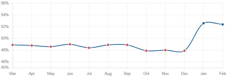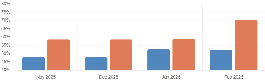 Despite cost headwinds, demand fundamentals look solid. The New Orders Index held at 55.8% (down slightly from 57.1 in January), registering a second straight month of expansion after four months of contraction.