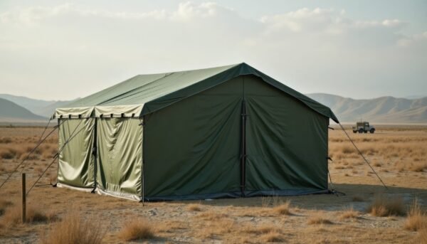Home How Fabric Structures Are Transforming Industrial And Commercial Spaces Military green tent stands in open field. Durable shelter practical option for outdoor events. Likely temporary shelter for military operations. Vehicle visible in distance. Open landscape surrounds