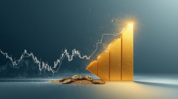 Home Dow Today: Stocks Pull Back as Gold Hits Record Highs—What Investors Need to Know Abstract financial illustration showing a stock chart declining on one side and a glowing gold bar rising on the other, symbolizing stock pullback and record gold prices.”