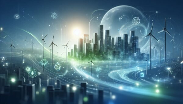 A futuristic clean energy concept illustration showing a modern city powered by advanced technology, with soft blue and green lighting to symbolize innovation and sustainability. Include abstract shapes or glowing energy lines to suggest progress and transformation. The mood should feel optimistic and forward-looking, suitable for an article about emerging technologies and corporate growth.